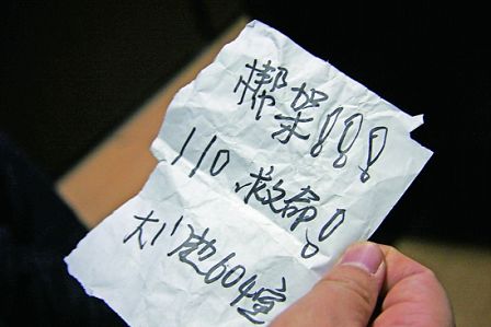 纸片是从6楼飘下的,上面用黑笔写着“绑架!!!110,救命!大门边604室”。