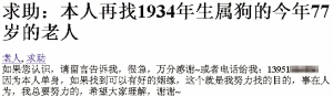 “如果您认识1934年生属狗的今年77岁的老人,请留言告诉我,很急,万分感谢或者电话给我:1395XXXX886。因为本人单身,如果找到可以有好的姻缘,这个就是我努力找的目的,事在人为,我总要努力的,希望大家理解,谢谢!”昨天,南京一女孩网上发帖紧急求助,网帖中还贴了求助人的一张照片,是一位靓丽的美女照片。开始有网友以为她是在征婚,但一个80后女孩怎么会找70多岁的人呢?于是很多网友对此产生了浓厚的兴趣,纷纷发帖询问,最终了解到,这位女孩需要一位77岁老人穿过的衣服,只有找到了才能化解命中的“劫”,才能找到一位如意郎君。