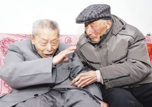 101岁的朱文国(右)欠身向端坐沙发上99岁的“小舅舅”拜年问好。汪武 陈咏摄