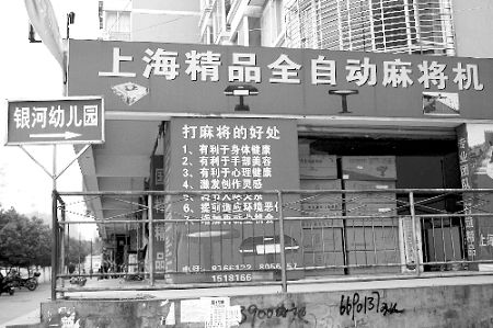 “请问那个麻将广告在哪里呢?”昨日下午,记者来到五里堆,由于不知道具体位置,就向附近居民打听,居民王先生说,“就在前面,这里的人都晓得。”根据王先生指点,记者远远地就看到店铺的墙壁上写着网友所说的广告。而在广告的旁边,一块写有“银河幼儿园”的指示牌非常醒目,幼儿园就在该店铺旁边。