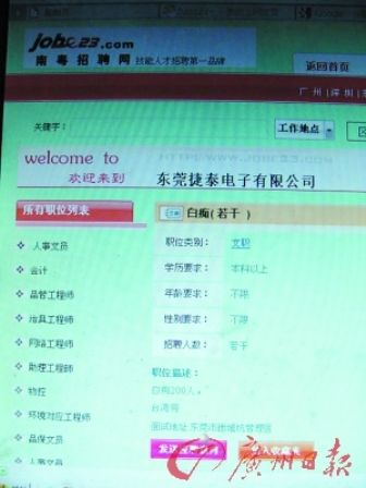 昨日,有读者向记者报料,在一家知名招聘网上,一家名为“东莞捷泰电子有限公司”的企业,发布了一则招聘信息,声称招聘“白痴”和“人妖”。