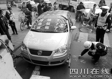 “停错了!遭起了!被拖了!”14日上午,在成都太升南路儿童医院旁,一辆乱停乱放的标致307被交警罩上了一件特殊的“外衣”,“外衣”上醒目的几行字,引起了不少市民驻足围观。面对如此“雷人”的外衣,市民褒贬不一。