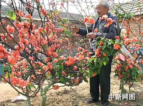 图为花农在给沂州海棠花人工授粉。 作者:夏洪雷