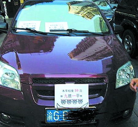 挂着“本车相撞10次,九胜一平”标语的轿车