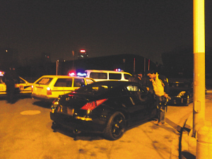 就在记者采访的时候,4辆豪车又回到了奥体北门。大家停好车,纷纷下车抽烟聊天。记者急忙追了上去,只见在奥体北大门西侧路面上,一字排开着4辆颜色不一的豪华跑车,车尾处留下了一道道长长的刹车痕迹,足见停车前的速度很快。4辆颜色不一的豪华跑车中,有三辆车子上没有上牌照,有一辆车子车牌挡着。车上下来的都是年轻人,车手都是男的,每人身边跟着一位大美女。车主们说这些跑车都是自己私车,个个都自称是富二代,他们每个人所开的跑车都在80万至100多万之间,还不是最好的车辆。见此情况,记者立刻报了警,并拿出相机拍照采访。