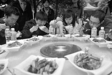 前日中午,在郫县太清路一家饭店的圆桌边,十名胸口佩戴号码牌的网友围坐一圈。数分钟后,服务员为每名网友端来一碗米饭和半斤凉拌鸡肉,等工作人员一声令下,网友们立即埋下头狼吞虎咽起来。