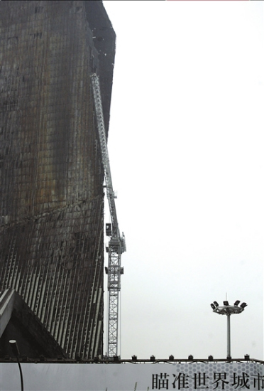 央视失火楼旁竖起塔吊。实习记者白婧盟摄