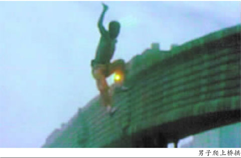 昨日下午3点,一辆奔奔车停在彩虹桥上,一名身穿粉红色短袖、黄色长裤和白色皮鞋的中年男子走出车,一手拿着一瓶装满汽油的塑料瓶,一手握着一把匕首,径直朝桥中央的桥拱爬去,嘴里一直嘟囔着。路人发现后,纷纷对男子大喊“快下来”。但他仍往上爬,最后坐在4米高的桥拱顶,把上衣脱了扔下来,并不停用匕首朝汽油瓶口反复刺着,还摇晃着身体,随时有可能会掉下来。