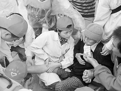2008年四川汶川特大地震后,一名西部计划志愿者为孤寡老人接骨。