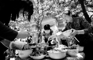 昨天中午12点,康宏小区18幢楼下小花园的石桌上,摆满了十多道香气四溢的佳肴。石桌旁的两张木制饭桌旁,围站着近30位小区居民:有70多岁的老人、还有牙牙学语的孩童……他们手中都拿着自带的碗筷,正等着刘奶奶开席。