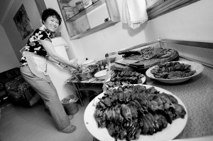 每次“拼饭”金奶奶都要亲手让邻居品尝到她特制的包谷饭和具有其老家东川特色的凉米线。她得知楼上的刘奶奶要设宴答谢邻居,昨日一大早,她就到菜市场购买了包谷面和制作凉米线的材料。“一般人还不会做。”金大妈自豪地说。