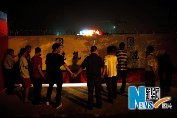 5月9日凌晨,家属在发生事故的工地门口等待消息。新华社记者卢汉欣摄