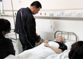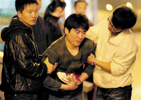 女孩的男友抱着她的鞋,不愿离去 本组图片 记者 白桄 摄
