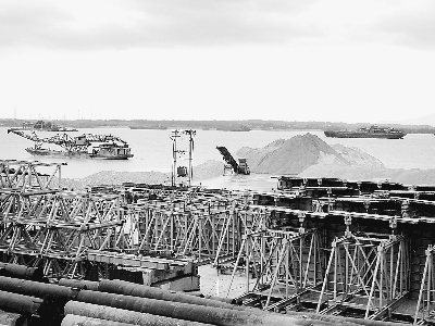 4月22日,大桥施工现场和高压线铁塔附近,河道非法采砂猖獗。记者 吴齐强摄