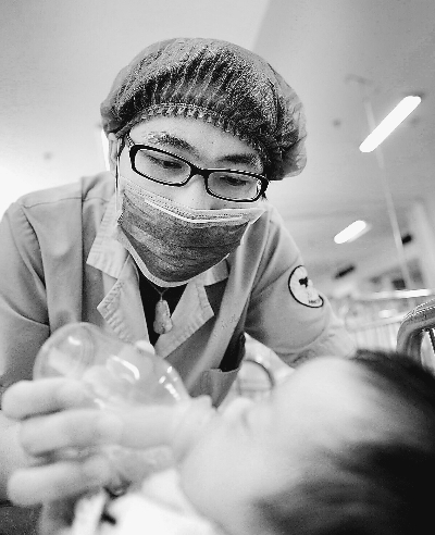 图为湖南儿童医院新生儿一科男护士在护理病房给宝宝喂奶(5月10日摄)。新华社记者 龙弘涛摄