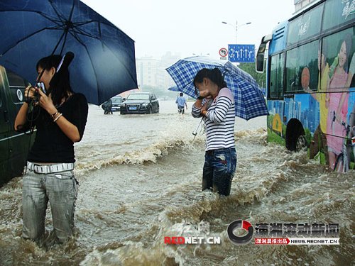 (5月13日上午,株洲长江广场出现大面积积水,现场已经是一片汪洋了。两位电视台的记者在现场采访。图/潇湘晨报滚动新闻通讯员 青琪)