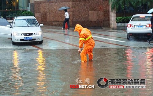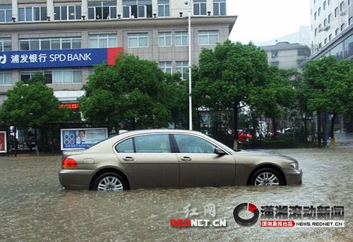 上午10点左右,记者赶至长江北路长江广场时,那里已经出现大面积积水,株洲天元交警对长江广场到韶山路口实施了交通管制。路边一些行人则在脱鞋,准备光脚过马路。一些底盘较低的轿车选择“硬冲”,结果行至路中间熄火了。驾驶湘AA8279宝马轿车的司机就是其中之一,“我没想到水有这么深,所以才开过来,结果熄火了。感觉开车跟开船似的。”