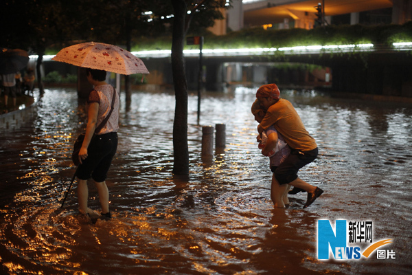 5月14日晚,市民在广州中山涉水通过马路。当日,广州再次遭遇暴雨侵袭,大雨造成多处水患,截至晚上22时30分,中心城区已接到17份内涝报告。广州市于14日17时20分启动防御暴雨三级应急响应,市水务局下雨之前已派出有关人员到易发生水浸的地区布防,并采取一系列应对措施。新华社记者 吴鲁 摄