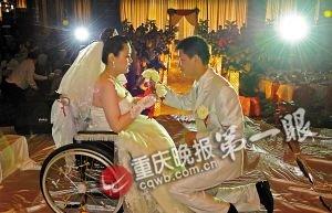昨(16日)中午,重庆渝北区天宇大酒店,高大英俊的新郎,迈着笃定的步伐走近新娘。他跪在坐着轮椅的新娘面前,许诺照顾她一生。