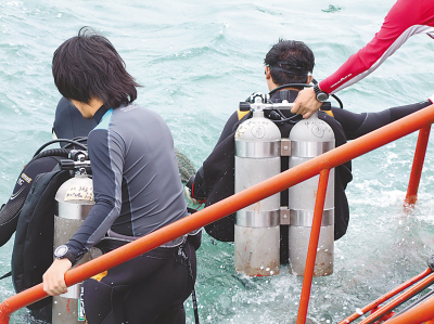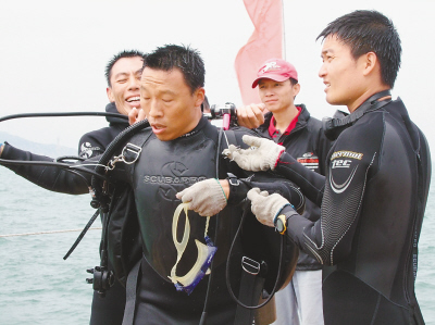 考古队员张勇(画中正背对者),背着高氧气瓶准备下水。记者杨雪梅摄