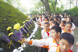 学生们在北碚梅花山张自忠将军烈士陵园献花。记者 许恢毅 摄