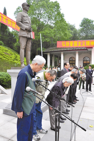 昨天,纪念抗日名将张自忠殉国70周年大会,在梅花山张自忠陵园举行,张廉云还与重庆市委常委、统战部部长翁杰明等人一起,为张将军铜像揭幕。 “张将军,我看您来了!”92岁的张自忠部下老兵张可宗献花圈后,在刚揭幕的将军铜像前,敬上标准的军礼。此外,张将军当年的警卫员、现居住在沙坪坝的96岁老人曹廷明也赶来祭拜。