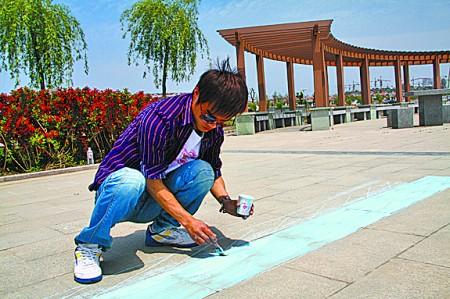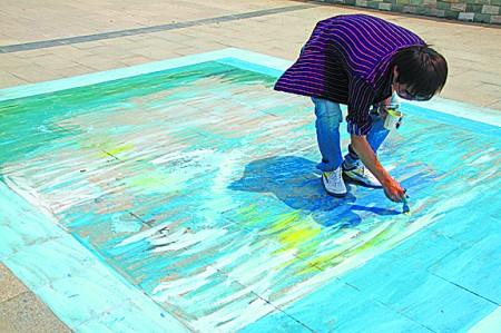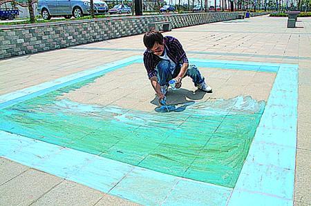 蓝色粉笔,几盒颜料,在画师马赫的画笔下,能让画的水池“跳”出来。14日中午,画师马赫在临沂涑河南街和狼牙王路交叉口的沿河广场现场展现他的3D绘画技能。