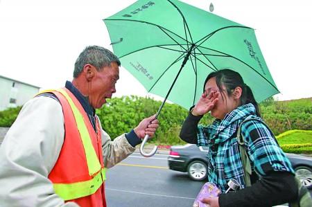 雨中的张国顺已经等了2个小时,为什么要等?他这样说:“已经找到钱包主人了,就等等吧。”朴实的话语,让人感动。可张国顺为张娜娜撑起雨伞的瞬间更让人感动。我们猜想,如父亲般和蔼的老张也许也有一个这么大的女儿,他安慰呵护着她,这分感动让人难忘。