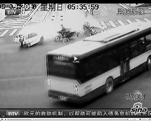 电视截屏显示“三轮哥”幸运躲过两辆车的前后夹击。
