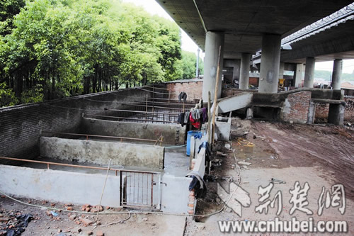 昨日下午2时15分许,记者在报料人的带领下,赶到107国道往武汉方向京珠高速高架桥下约200米处,看到桥下有个用灰砖围起的高2米左右的院子,很远就能听到猪一声高过一声的惨叫。院子的铁栅栏大门用塑料布裹得严严实实,看不清里面的人正在做什么。