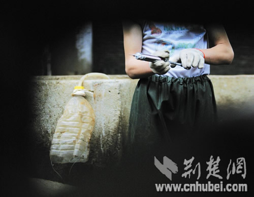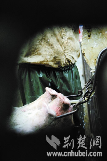 透过院墙上的一个小洞,记者看到一条给猪注水的“流水线”:有人正在一辆有上下两层的货车车厢内,将数十头猪赶到院子里的猪栏;有人马上将进入猪栏的猪用铁钩钩住下嘴唇,将猪一队队地挂到猪栏的一个铁栏杆上,这时,猪已动弹不得;有人用一支大号注射器给猪打针;接着便有人将一根拇指粗、长约1米的水管插入猪的嘴里,水管的一头连接着一个5升的油壶;有人接水倒入油壶内,约5公斤的水便强行灌入。