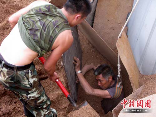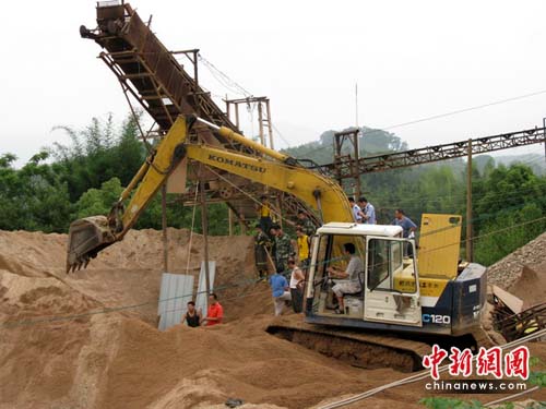 10时30分,一台大型挖掘机紧急开赴营救现场。并迅速将坑底外围的河沙清理掉,慢慢挺进中心位置。由于挖掘机工作时振动较大,不时有松散的河沙从高处流向坑底,对营救工作造成极大困难。坑底营救队员在外围人员的协助下,用护沙物不断加大被困人员的保护范围,并与被困人员进行交流,消除被困人员的焦虑、恐慌心理。