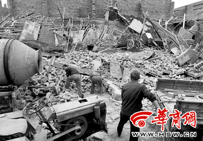 昨日(21日)下午4时30分左右,未央宫附近东张村一户姓朱的人家在建民房直接坍塌,几名正在楼顶抹水泥的民工一下子就消失在断掉的楼板、新砌起的砖墙之中。在旁边另一家盖房子的民工张万亭参加了刨废墟救人,他说:“忽然就看见那座房子歪了,跟大山滑坡一样,两层楼一眨眼就塌掉了。”