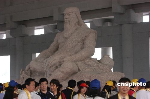 资料图片:2009年5月20日,来自美国、加拿大、香港、澳门、台湾等30多个国家和地区的华侨华人代表,在湖北随州市共同拜谒了中华民族的始祖炎帝神农。图为来宾参观炎帝神农雕像并合影。 中新社发 张畅 摄