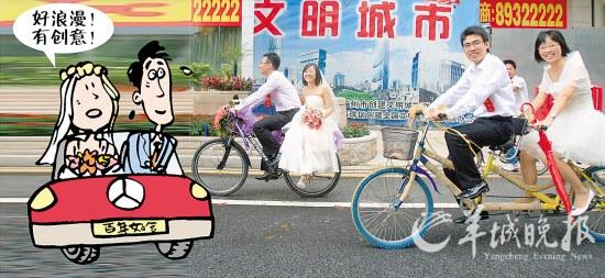 没错,这是一场别出心裁的单车婚礼。昨天上午,这对新人———新郎“寻找”、新娘“小驴佳佳”,在雨后初晴的广州,如愿举行了他们浪漫的“单车婚礼”。五六十名相识与不相识的“驴友”(网络用语,泛指爱参加旅游、自助游的朋友),响应了这对新人的号召,骑车前来助阵,成全了这支特别的“婚礼车队”。
