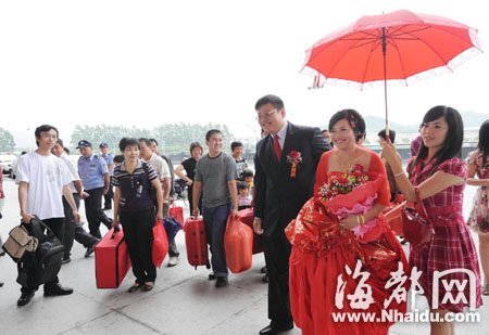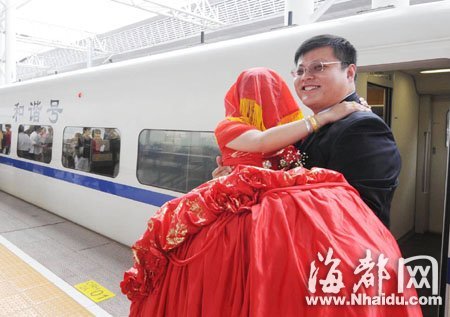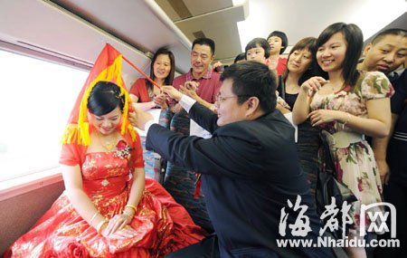 提着红枣桂圆汤,掀起新娘的红盖头,为一节车厢的乘客分发喜糖,昨天上午9时41分,新郎官郭晓峰坐上动车,准备将自己的媳妇黄菲菲迎娶回福州的家,动车乘客们见证了他们特别的娶亲仪式。