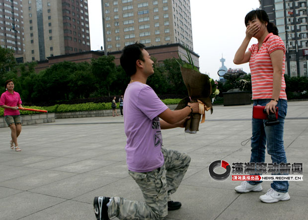 “胡安萱,我好爱好爱你!”70米长的大红横幅从象征“幸福”的摩天轮上垂下,长沙小伙王乐手捧玫瑰单膝下跪向女友求婚:“老婆,嫁给我吧,我们生个儿子让他早点过儿童节!”