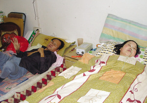 今年59岁的黄瑞根,家住镇江新区银山鑫城小区,曾是名医生。昨天上午,记者来到黄瑞根与妻子所住的车库里,推开门就看到窄小的空间里摆放着两张床。黄瑞根正因晚期骨癌引起的剧痛,在痛苦地呻吟;妻子则睡在他的旁边,鼻孔里插着一根导管,虽然是个“睡”了3年多的植物人,但面色红润。
