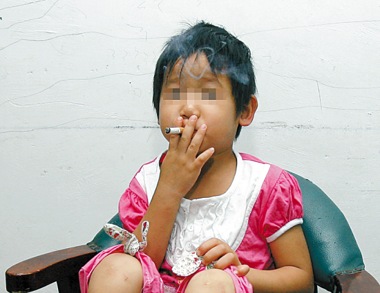 “六一”儿童节,和父母居住在惠州惠民大道边一废品棚的小雅文逛街时没有吃上肯德基,尽管她已央求母亲很久。回到家里,台面上的香烟却令不到4岁的她很兴奋,她熟练地抽出香烟叼在嘴上,拨动打火机点燃香烟。从她吐出烟雾的神态来看,她很投入,对她来说,这也许是儿童节最大的享受,她的父母只好无奈地在一边看着她。