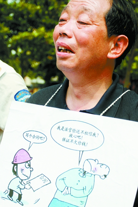 “别人拖欠农民工工钱我们可以去法院告,但法官拖欠我们血汗钱我们上哪儿告去。”昨日,5名来自封丘县的农民工,身背讨薪漫画,在郑州闹市区寻求帮助。