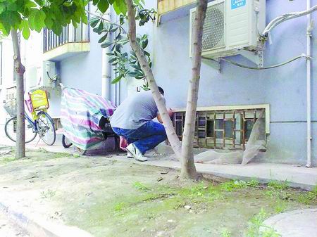 该楼上的一居民说,那名男子就在楼洞口东侧不远处的地下室。顺着该居民手指的方向,记者找到了那个地下室窗户,窗户紧挨地面,一中年男子正蹲着对地下室内的男子劝说,但没有任何回应。