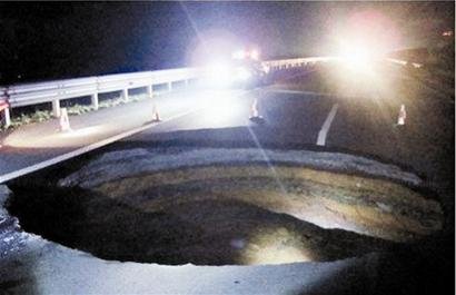 前天凌晨零点25分,类似一幕发生在浙江黄衢南高速公路江山段:高速公路路面忽然塌下形成一个直径8.3米深6米的大洞。幸亏当时来往车辆及时避开洞口,避免了人员伤亡事故的发生。