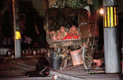 昨天下午6点,丰台区右安路出现蹬着人力三轮车流落街头的一家8口。车上铁笼内,6名孩童和一只大黑狗住在一起,最大孩子不过十来岁,最小孩子一两岁。