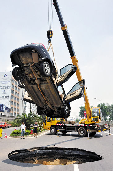 上周五,陷入南昌街头塌陷路面上的小轿车被吊离现场 新华社 发