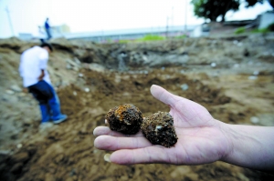 图为记者在工地现场发现的两枚铁疙瘩。晨报记者 郝笑天/摄