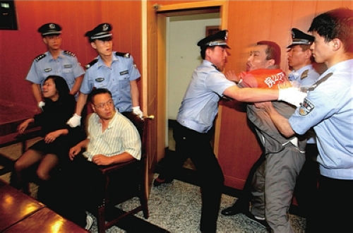 肇事司机张文明在法庭上情绪激动,他的妻子和大舅哥也分别被控制。本报通讯员李倩摄