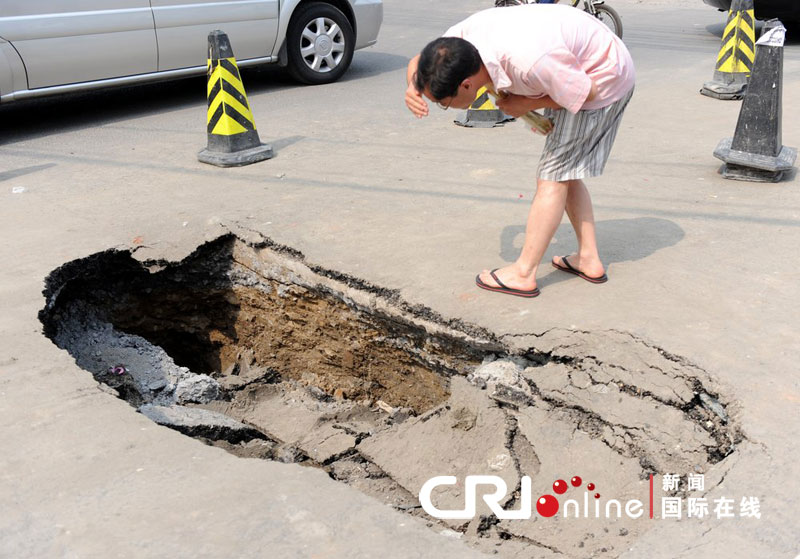 2010年6月19日中午,北京朝阳区将台西路与酒仙桥路交界处,路面塌陷现2米深坑,幸无人员伤亡。路面塌陷现2米深坑,一名路人弯腰观看。