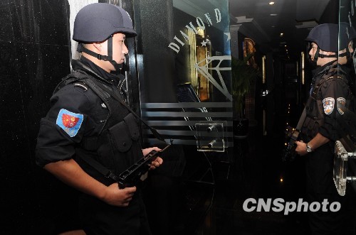 重庆希尔顿酒店因股东涉黑,介绍、容留妇女卖淫,违法经营和故意扰乱社会秩序,于6月20日被当地警方责令停业整顿。图为警方清查该酒店内一夜总会。 中新社发 渝公安 摄