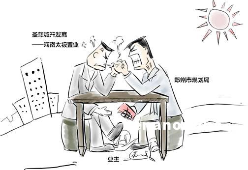 河南太极置业圣菲城4期近千平米违章楼在郑州市规划局执法队眼皮子底下成天疯长!而郑州市规划局执法队“马拉松”式的执法,为这个违章建筑的拔起赢得时间。近日,网上热传一则漫画,讥讽了网友眼中的郑州规划局pk圣菲城。