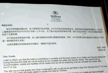重庆市渝中区两路口的希尔顿饭店,其大门紧闭谢客,希尔顿重庆营运总监彼得。鲁格(Peter Rugg)的致歉信被置于酒店门前。